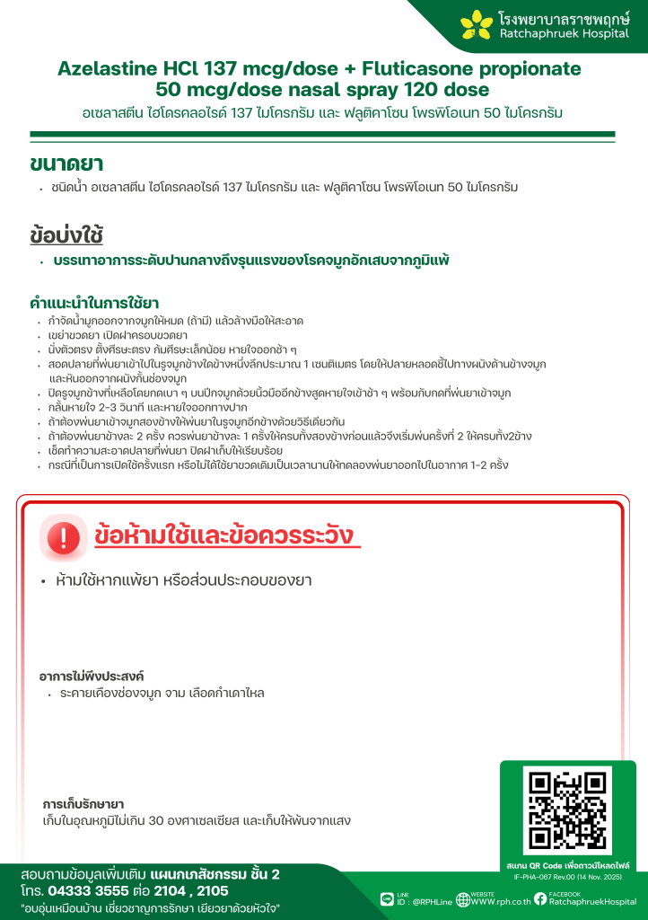 Azelastine HCl 137 mcgdose + Fluticasone propionate 50 mcgdose nasal spray 120 dose (อเซลาสตีน ไฮโดรคลอไรด์ และ ฟลูติคาโซน โพรพิโอเนท) 5 มกราคม 25695 มกราคม 2026qualityDrug Information, ความรู้สุขภาพ FacebookFacebookXXLINELine