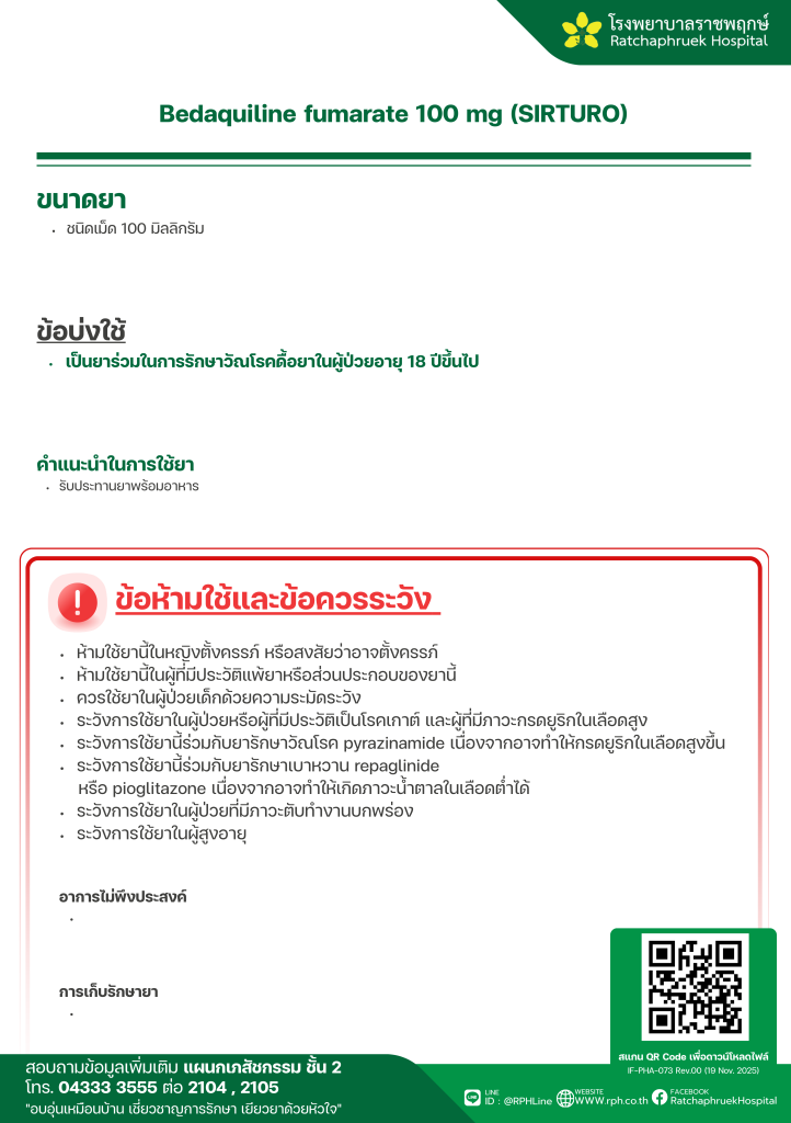 Bedaquiline fumarate 100 mg (SIRTURO) 5 มกราคม 25695 มกราคม 2026qualityDrug Information, ความรู้สุขภาพ FacebookFacebookXXLINELine
