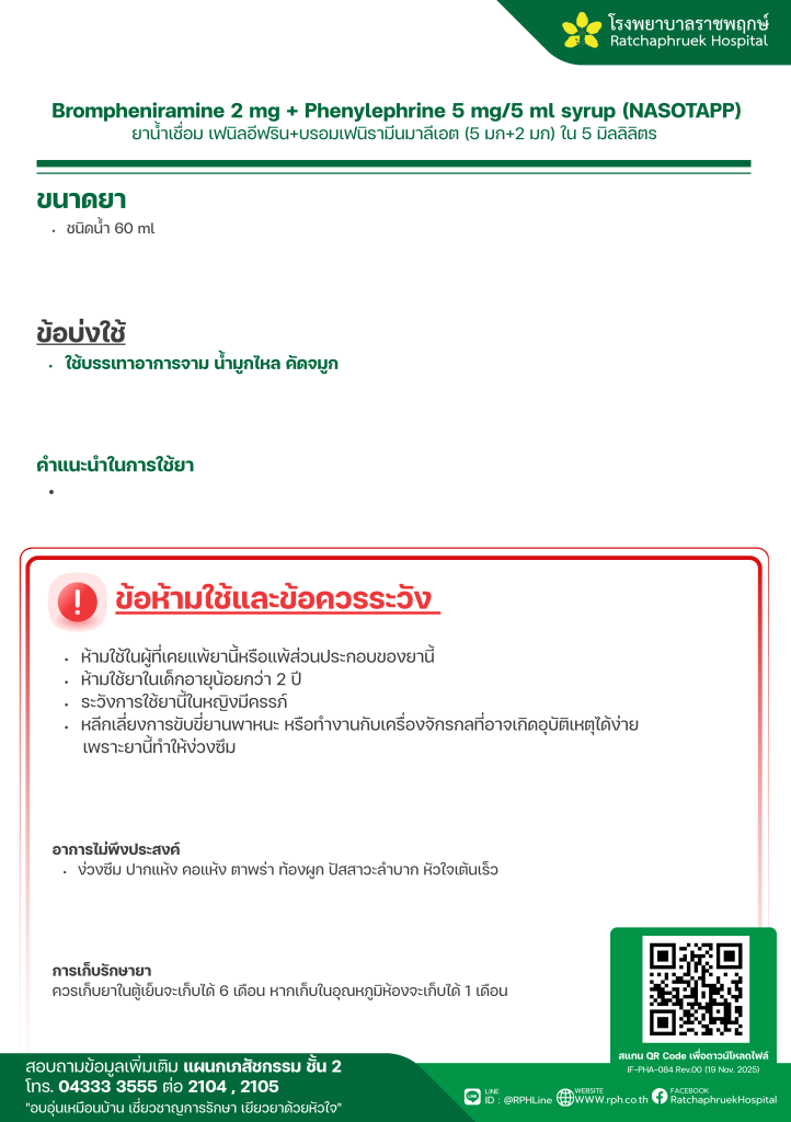 Brompheniramine 2 mg + Phenylephrine 5 mg/5 ml syrup (NASOTAPP) (ยาน้ำเชื่อม เฟนิลอีฟรินและบรอมเฟนิรามีนมาลีเอต) 6 มกราคม 25696 มกราคม 2026qualityDrug Information, ความรู้สุขภาพ FacebookFacebookXXLINELine