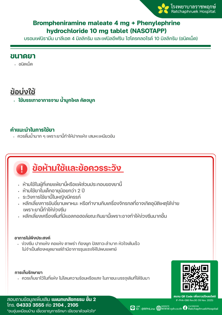 Brompheniramine maleate 4 mg + Phenylephrine hydrochloride 10 mg tablet (NASOTAPP) (บรอมเฟนิรามีน มาลีเอต และเฟนิลอีฟริน ไฮโดรคลอไรด์) 6 มกราคม 25696 มกราคม 2026qualityDrug Information, ความรู้สุขภาพ FacebookFacebookXXLINELine