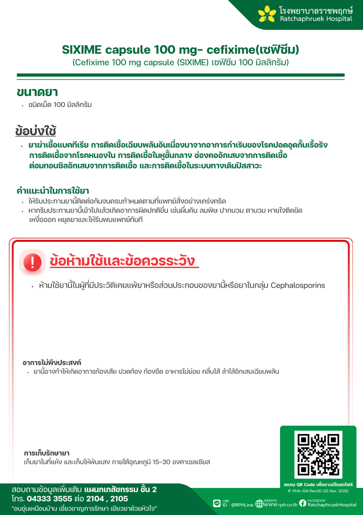 SIXIME capsule 100 mg- cefixime(เซฟิซีม) 7 มกราคม 256911 กุมภาพันธ์ 2026qualityDrug Information, ความรู้สุขภาพ FacebookFacebookXXLINELine