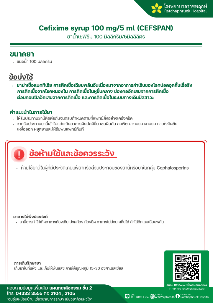 Cefixime syrup 100 mg/5 ml (CEFSPAN) (ยาน้ำเซฟิซีม) 7 มกราคม 25697 มกราคม 2026qualityDrug Information, ความรู้สุขภาพ FacebookFacebookXXLINELine