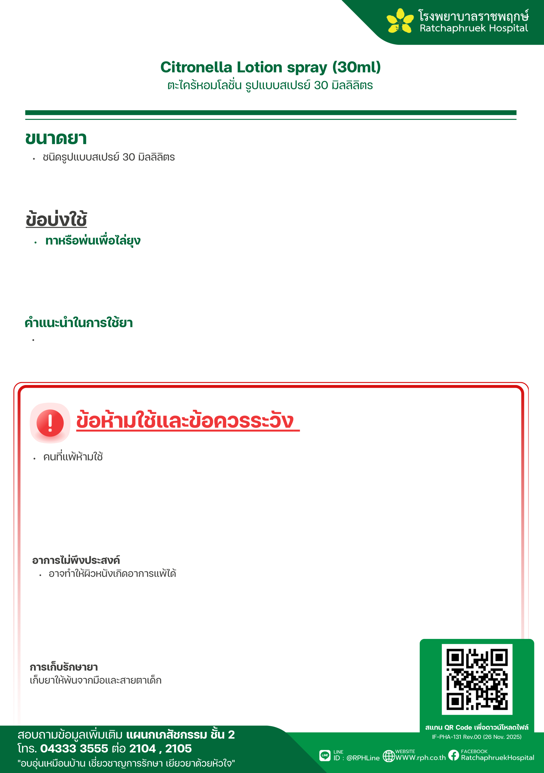 Drug Information Citronella Lotion spray (30ml) (ตะไคร้หอมโลชั่น รูปแบบสเปรย์) เมื่อวันที่ 8 มกราคม 2569