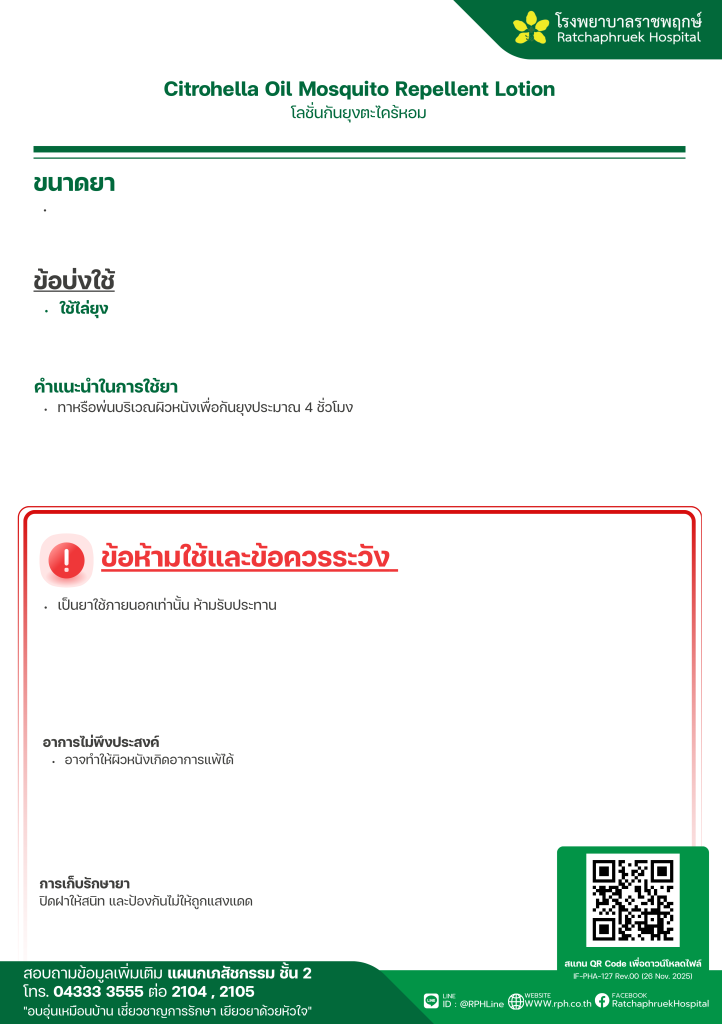 Drug Information Citronella Lotion spray (30ml) (ตะไคร้หอมโลชั่น รูปแบบสเปรย์) เมื่อวันที่ 8 มกราคม 2569
