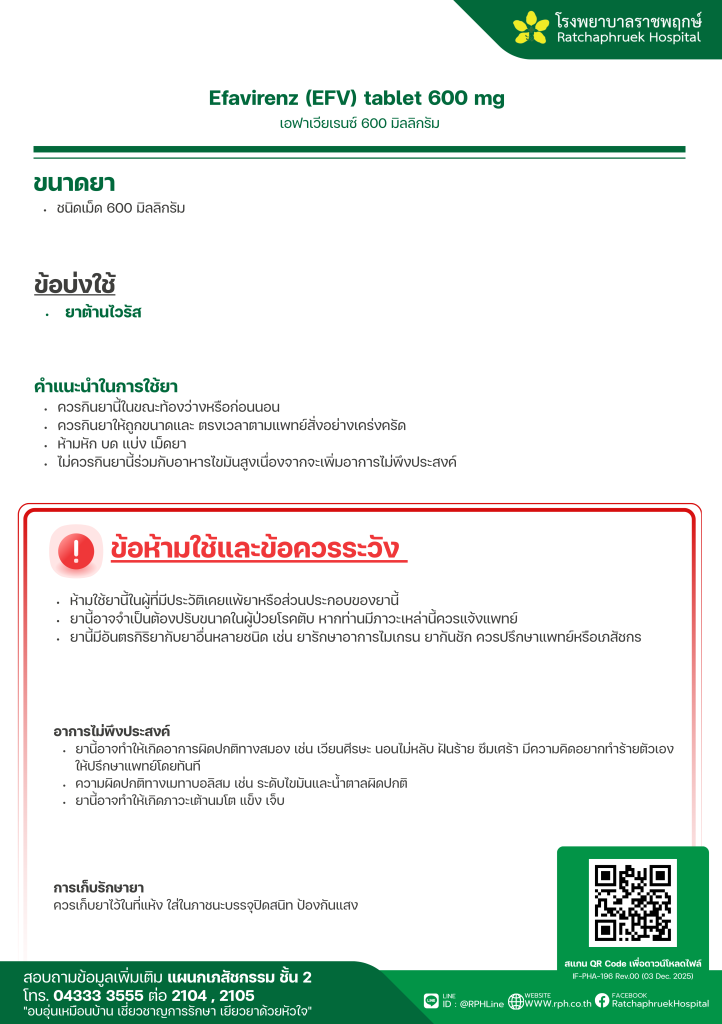 Efavirenz (EFV) tablet 600 mg (เอฟาเวียเรนซ์) 12 มกราคม 256912 มกราคม 2026qualityDrug Information, ความรู้สุขภาพ FacebookFacebookXXLINELine