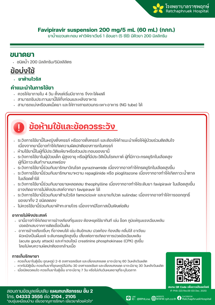 Drug Information Favipiravir suspension 200 mg/5 mL (60 mL) (กภก.) (ยาน้ำแขวนตะกอน ฟาวิพิราเวียร์) เมื่อวันที่ 13 มกราคม 2569