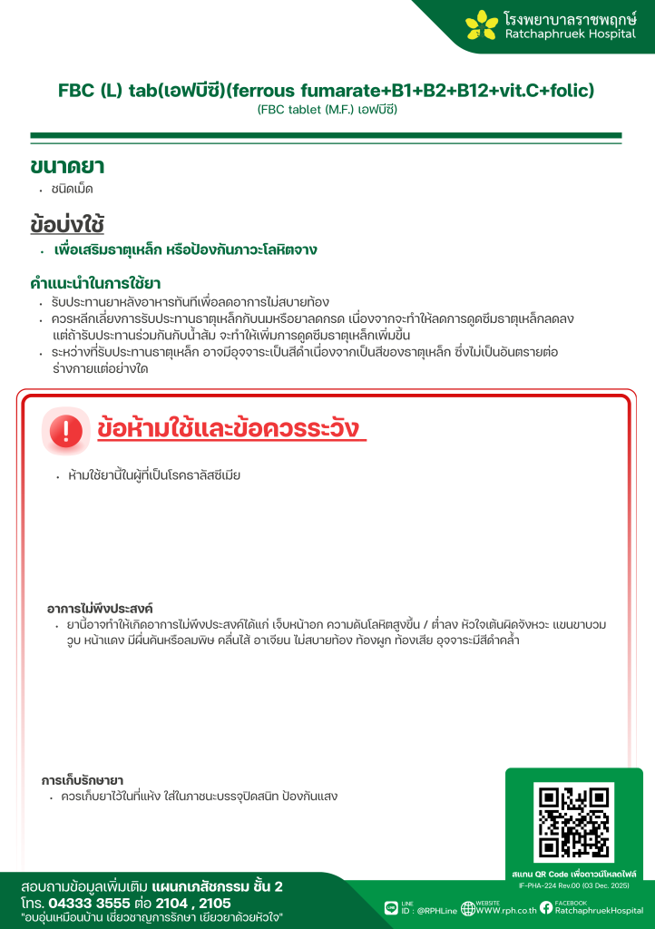 FBC (L) tab(เอฟบีซี)(ferrous fumarate+B1+B2+B12+vit.C+folic) 13 มกราคม 256916 กุมภาพันธ์ 2026qualityDrug Information, ความรู้สุขภาพ FacebookFacebookXXLINELine