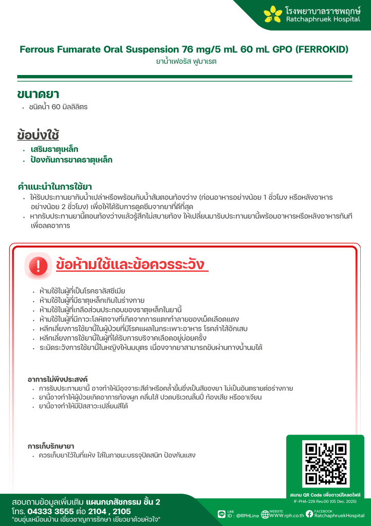 Drug Information Ferrous Fumarate Oral Suspension 76 mg/5 mL 60 mL GPO (FERROKID) (ยาน้ำเฟอรัส ฟูมาเรต) เมื่อวันที่ 13 มกราคม 2569