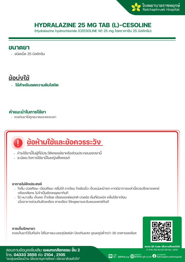 HYDRALAZINE 25 MG TAB (L)-CESOLINE 13 มกราคม 256916 กุมภาพันธ์ 2026qualityDrug Information, ความรู้สุขภาพ FacebookFacebookXXLINELine