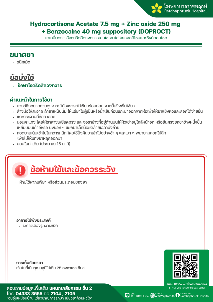 Drug Information Hydrocortisone Acetate 7.5 mg + Zinc oxide 250 mg + Benzocaine 40 mg suppository (DOPROCT) (ยาเหน็บทวารรักษาริดสีดวงทวาร) เมื่อวันที่ 13 มกราคม 2569