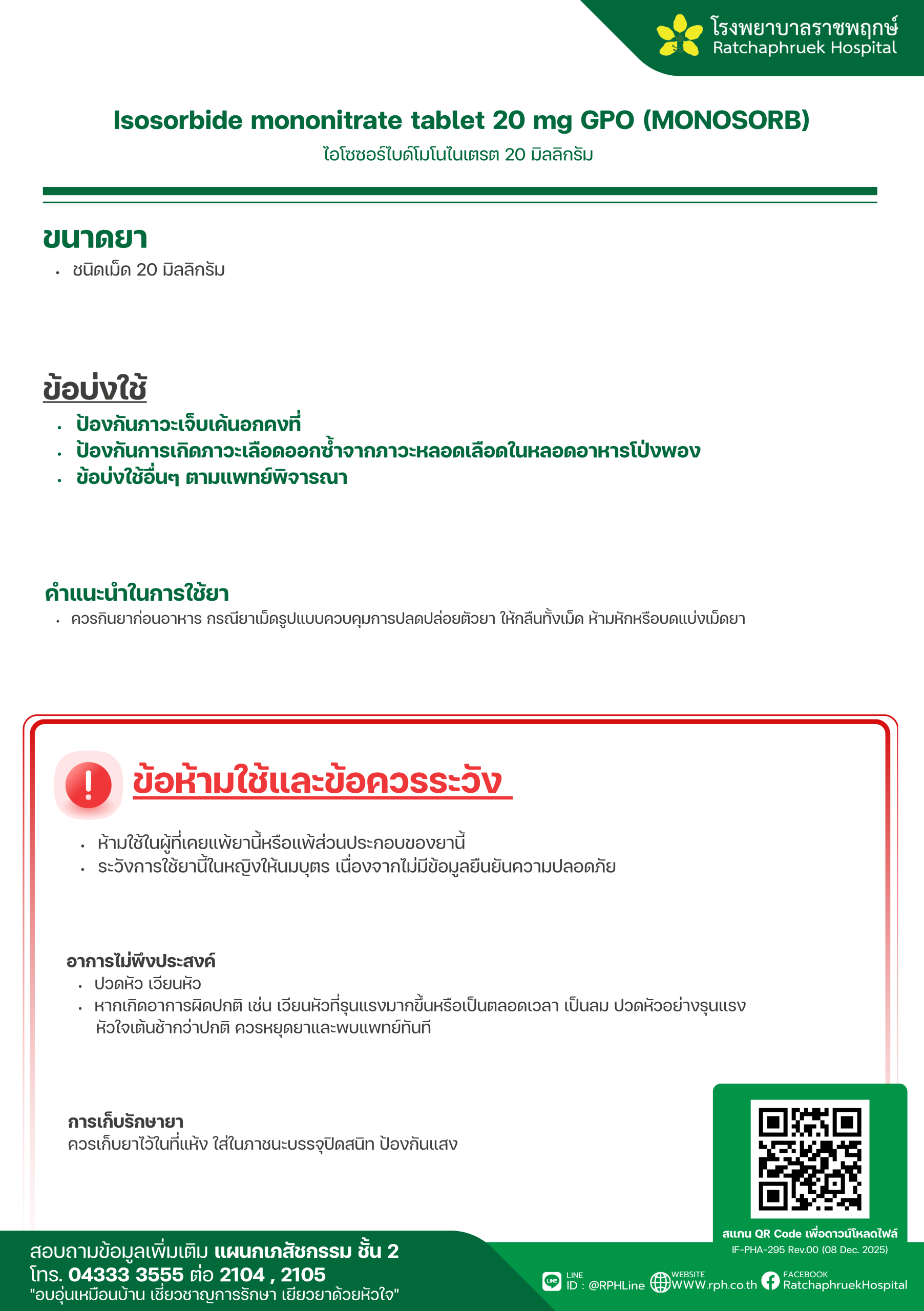 Drug Information Isosorbide mononitrate tablet 20 mg GPO (MONOSORB) (ไอโซซอร์ไบด์โมโนไนเตรต) เมื่อวันที่ 14 มกราคม 2569
