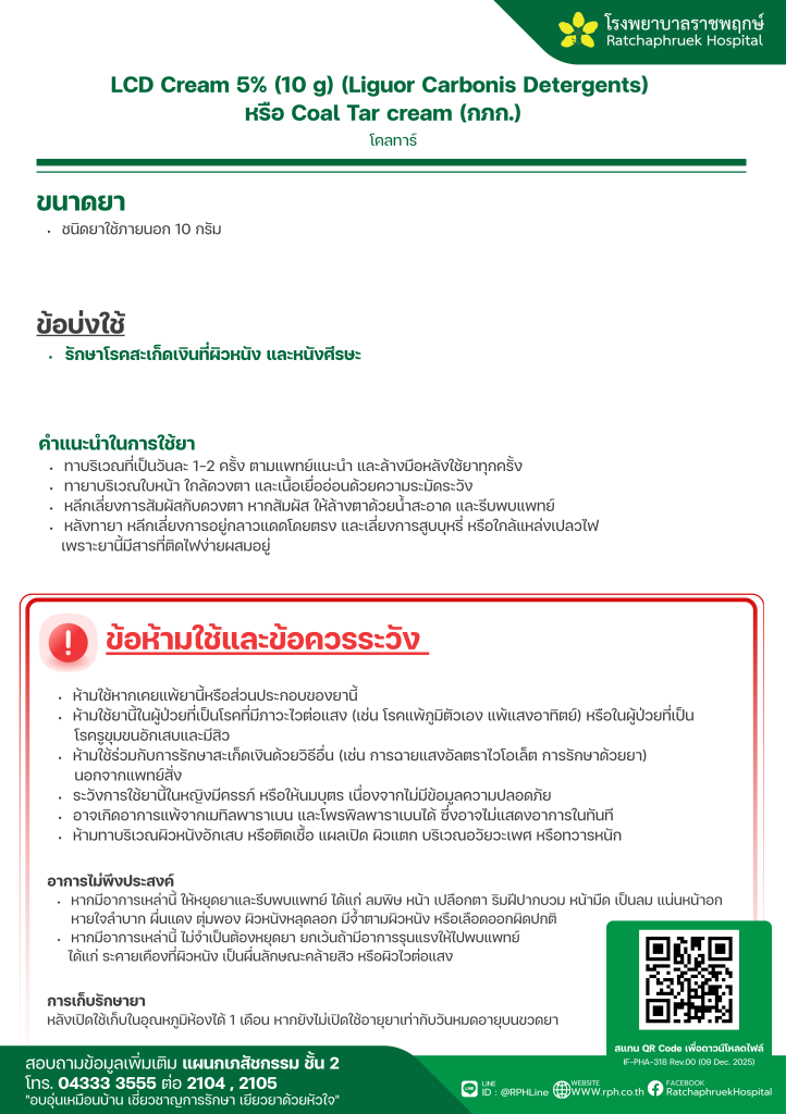 LCD Cream 5% (10 g) (Liguor Carbonis Detergents) หรือ Coal Tar cream (กภก.) (โคลทาร์) 19 มกราคม 256919 มกราคม 2026qualityDrug Information, ความรู้สุขภาพ FacebookFacebookXXLINELine