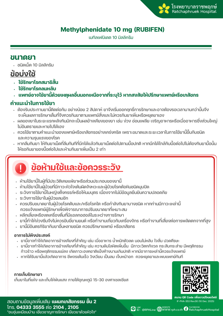 Methylphenidate 10 mg (RUBIFEN) (เมทิลเฟนิเดต) 20 มกราคม 256920 มกราคม 2026qualityDrug Information, ความรู้สุขภาพ FacebookFacebookXXLINELine