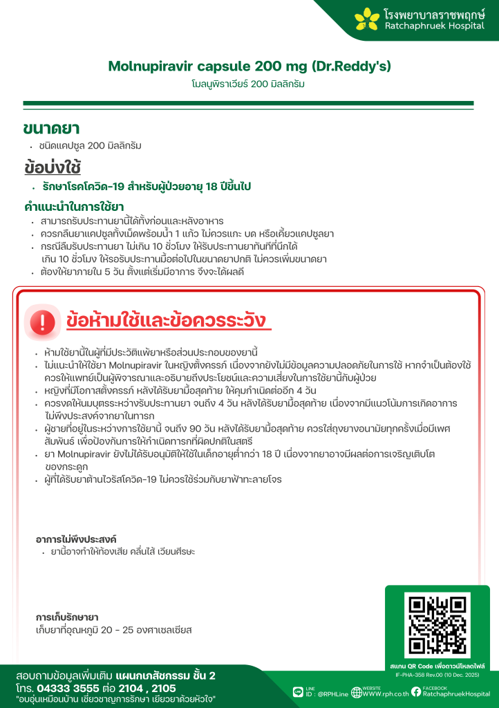 Molnupiravir capsule 200 mg (Dr.Reddy’s) (โมลนูพิราเวียร์) 20 มกราคม 256920 มกราคม 2026qualityDrug Information, ความรู้สุขภาพ FacebookFacebookXXLINELine