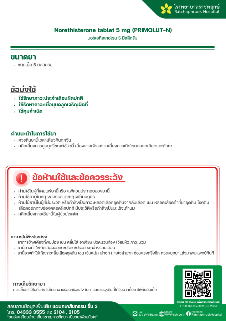 Norethisterone tablet 5 mg (PRIMOLUT-N) (นอร์เอทิสเทอโรน) 27 มกราคม 256927 มกราคม 2026qualityDrug Information, ความรู้สุขภาพ FacebookFacebookXXLINELine