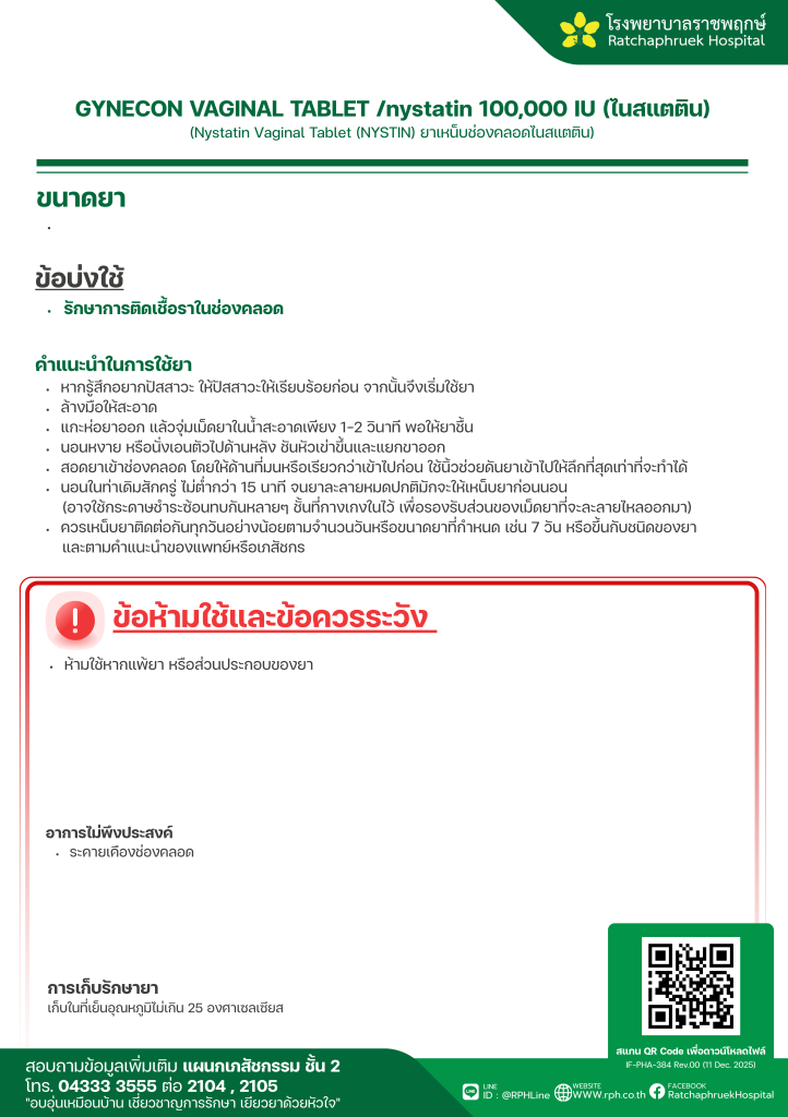 GYNECON VAGINAL TABLET nystatin 100,000 IU (ไนสแตติน) 27 มกราคม 256920 กุมภาพันธ์ 2026qualityDrug Information, ความรู้สุขภาพ FacebookFacebookXXLINELine