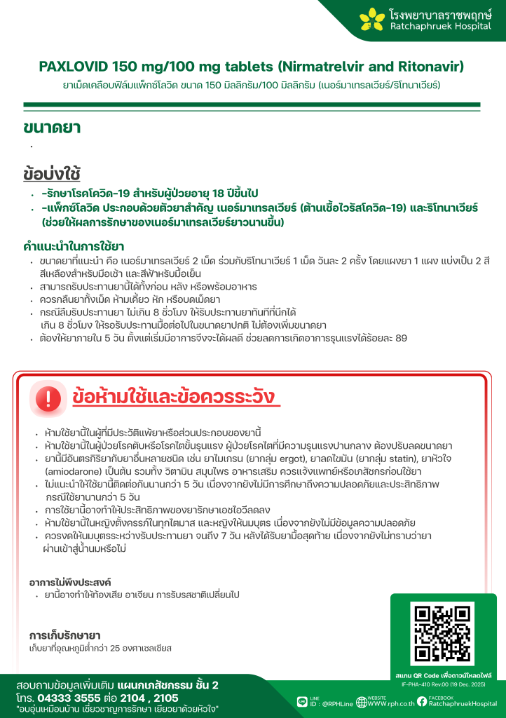 PAXLOVID 150 mg/100 mg tablets (Nirmatrelvir and Ritonavir) (ยาเม็ดเคลือบฟิล์มแพ็กซ์โลวิด) 28 มกราคม 256928 มกราคม 2026qualityDrug Information, ความรู้สุขภาพ FacebookFacebookXXLINELine