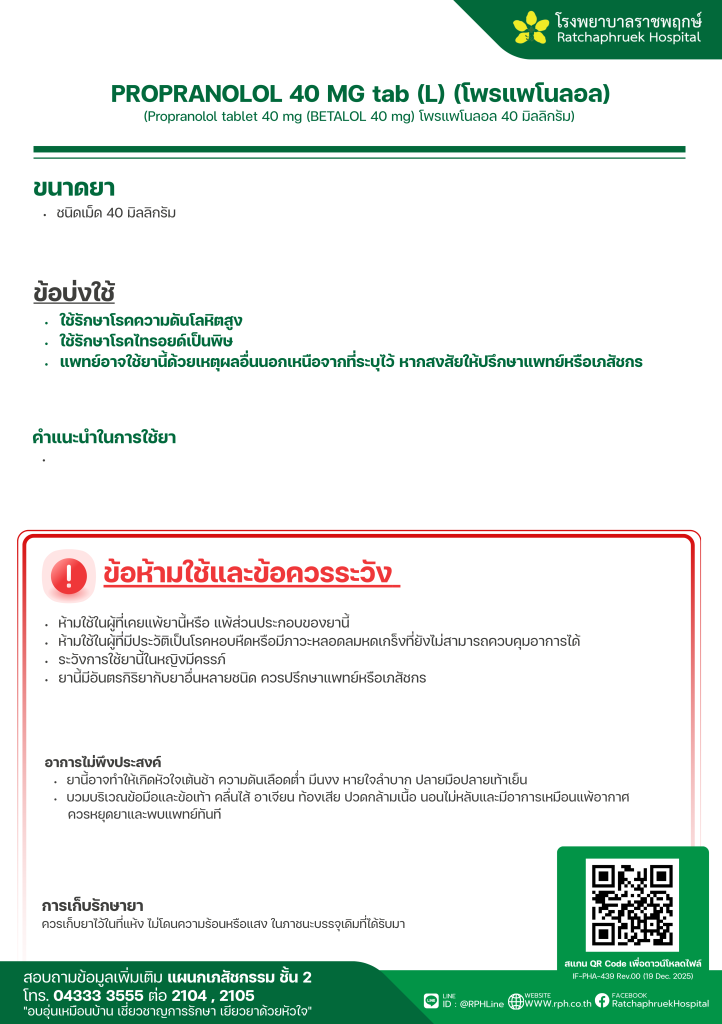 PROPRANOLOL 40 MG tab (L) (โพรแพโนลอล) 29 มกราคม 256920 กุมภาพันธ์ 2026qualityDrug Information, ความรู้สุขภาพ FacebookFacebookXXLINELine