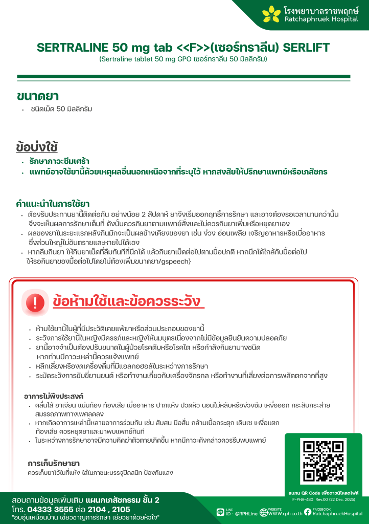 SERTRALINE 50 mg tab F(เซอร์ทราลีน) SERLIFT 29 มกราคม 256921 กุมภาพันธ์ 2026qualityDrug Information, ความรู้สุขภาพ FacebookFacebookXXLINELine
