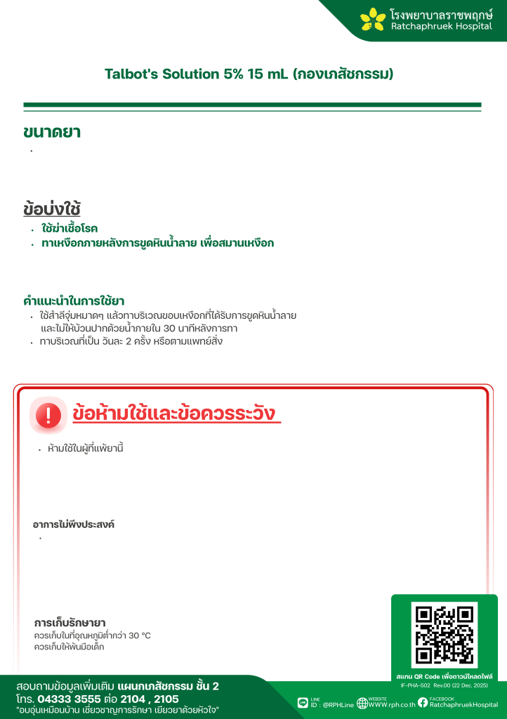 Talbot’s Solution 5% 15 mL (กองเภสัชกรรม) 30 มกราคม 256930 มกราคม 2026qualityDrug Information, ความรู้สุขภาพ FacebookFacebookXXLINELine