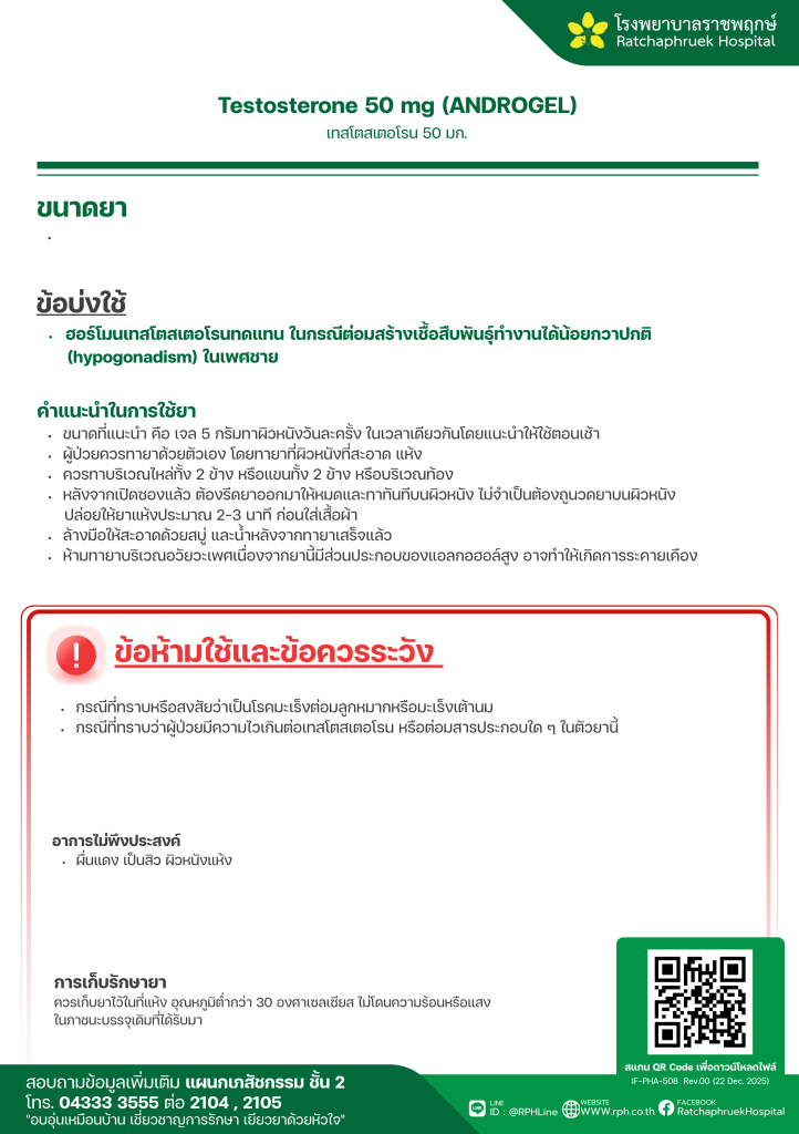 Testosterone 50 mg (ANDROGEL) (เทสโตสเตอโรน) 30 มกราคม 256930 มกราคม 2026qualityDrug Information, ความรู้สุขภาพ FacebookFacebookXXLINELine