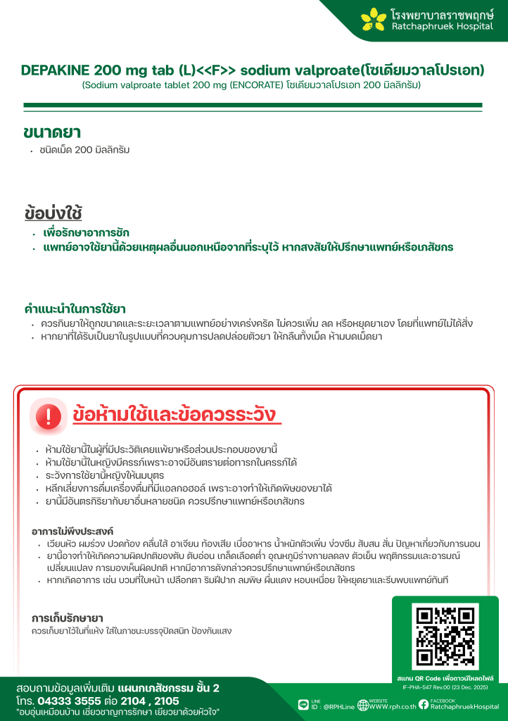 DEPAKINE 200 mg tab (L)F sodium valproate(โซเดียมวาลโปรเอท) 2 กุมภาพันธ์ 256921 กุมภาพันธ์ 2026qualityDrug Information, ความรู้สุขภาพ FacebookFacebookXXLINELine