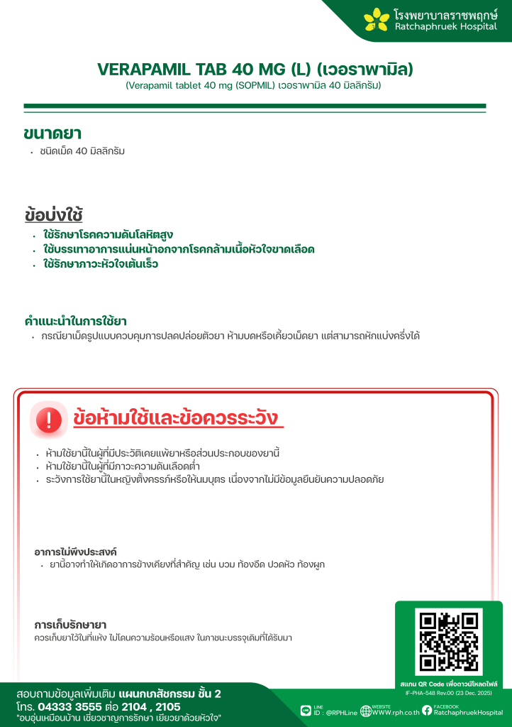 VERAPAMIL TAB 40 MG (L) (เวอราพามิล) 2 กุมภาพันธ์ 256921 กุมภาพันธ์ 2026qualityDrug Information, ความรู้สุขภาพ FacebookFacebookXXLINELine