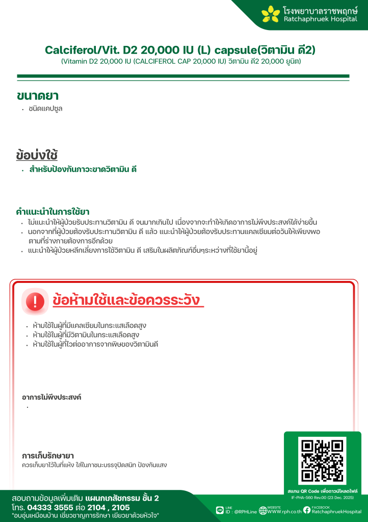 CalciferolVit. D2 20,000 IU (L) capsule(วิตามิน ดี2) 2 กุมภาพันธ์ 256921 กุมภาพันธ์ 2026qualityDrug Information, ความรู้สุขภาพ FacebookFacebookXXLINELine