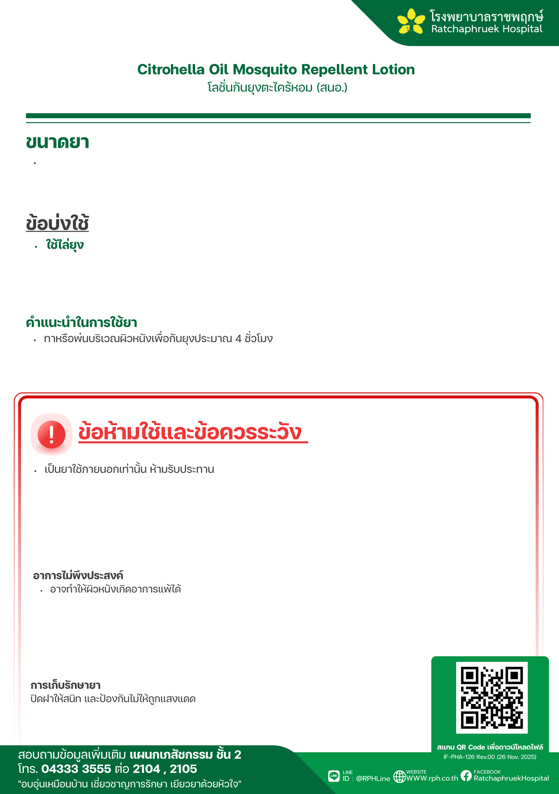 Drug Information Citrohella Oil Mosquito Repellent Lotion (โลชั่นกันยุงตะไคร้หอม) เมื่อวันที่ 8 มกราคม 2569