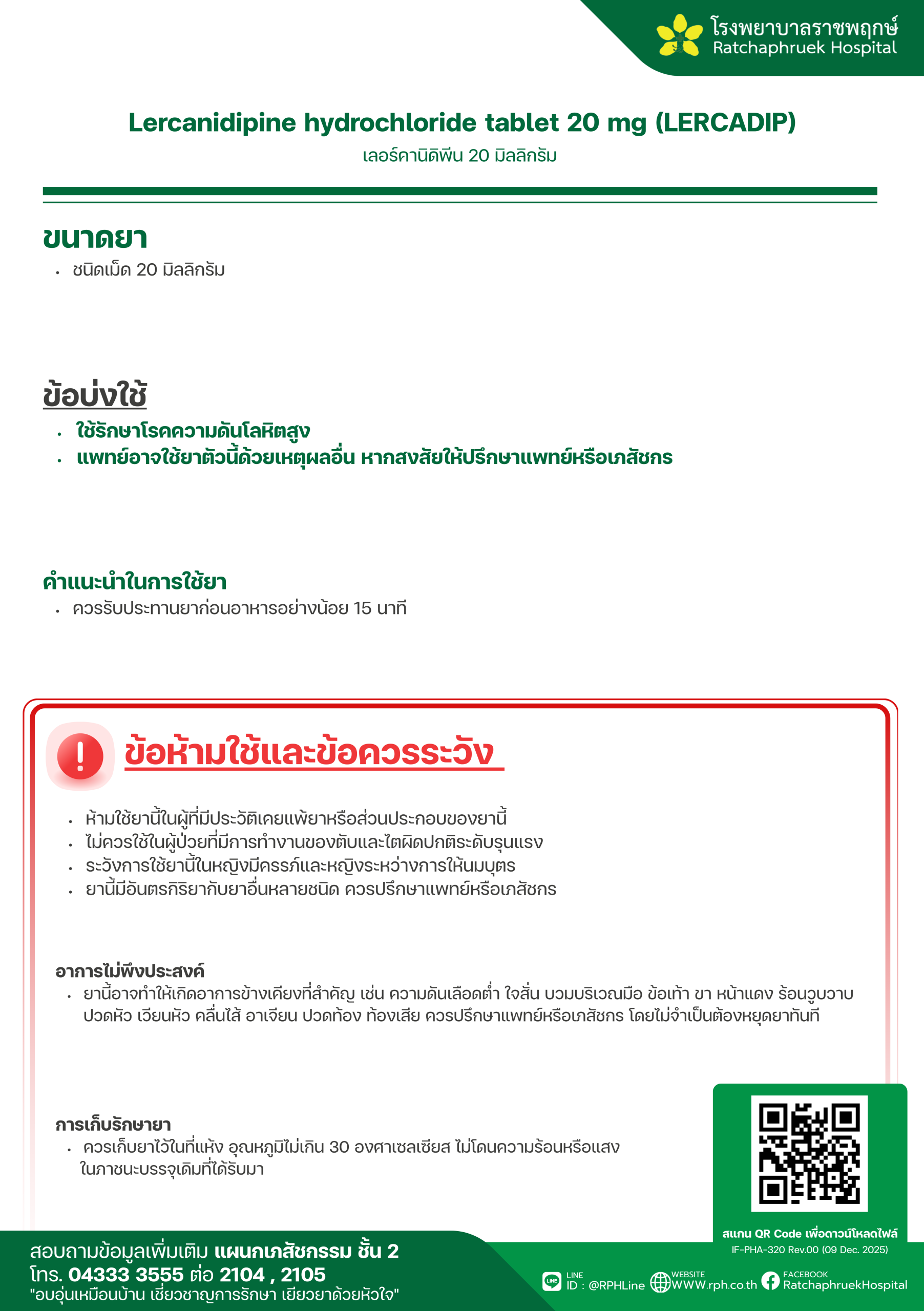 Drug Information Lercanidipine hydrochloride tablet 20 mg (LERCADIP) (เลอร์คานิดิพีน) เมื่อวันที่ 19 มกราคม 2569