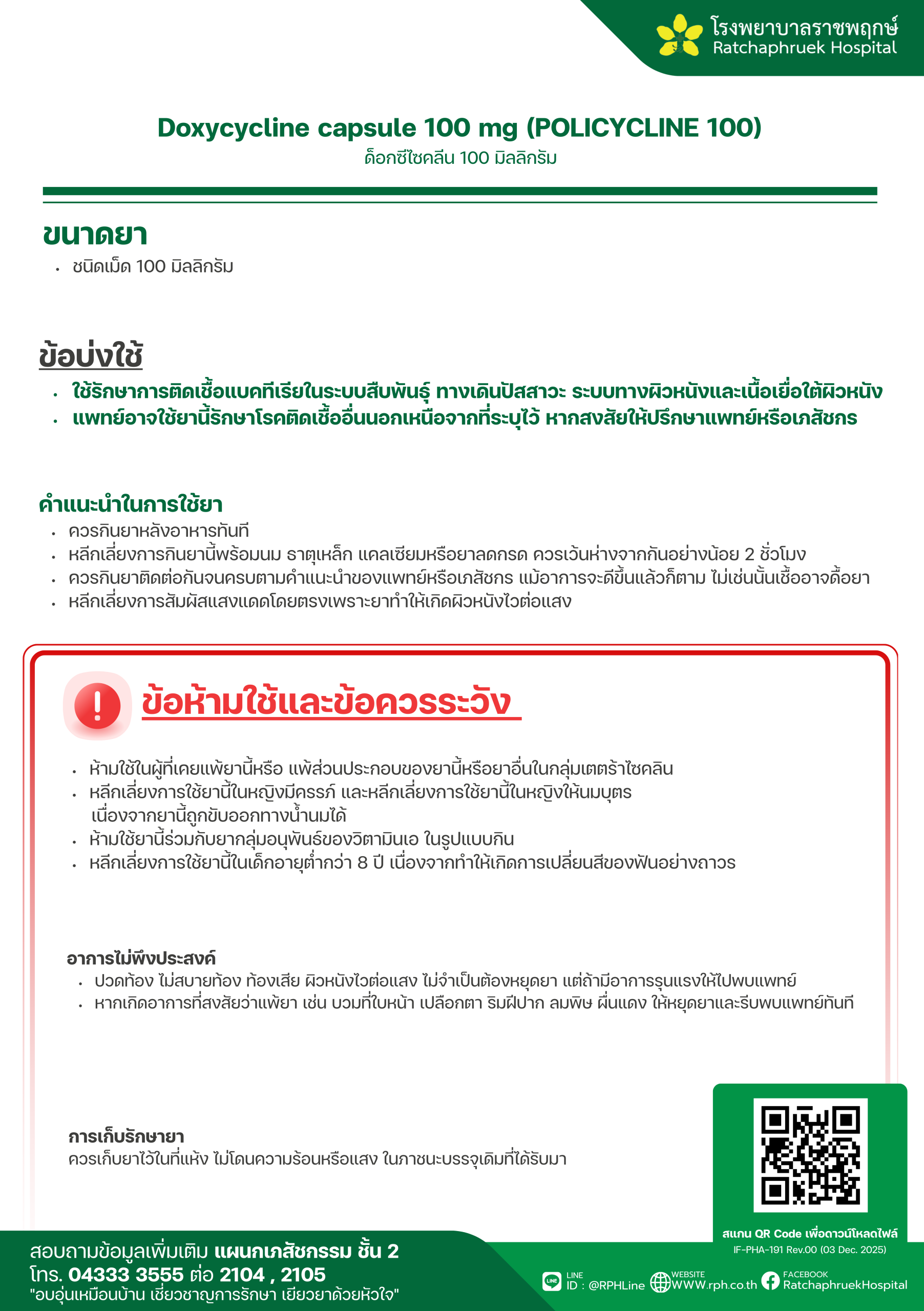 Drug Information Doxycycline capsule 100 mg (POLICYCLINE 100) (ด็อกซีไซคลีน) เมื่อวันที่ 12 มกราคม 2569
