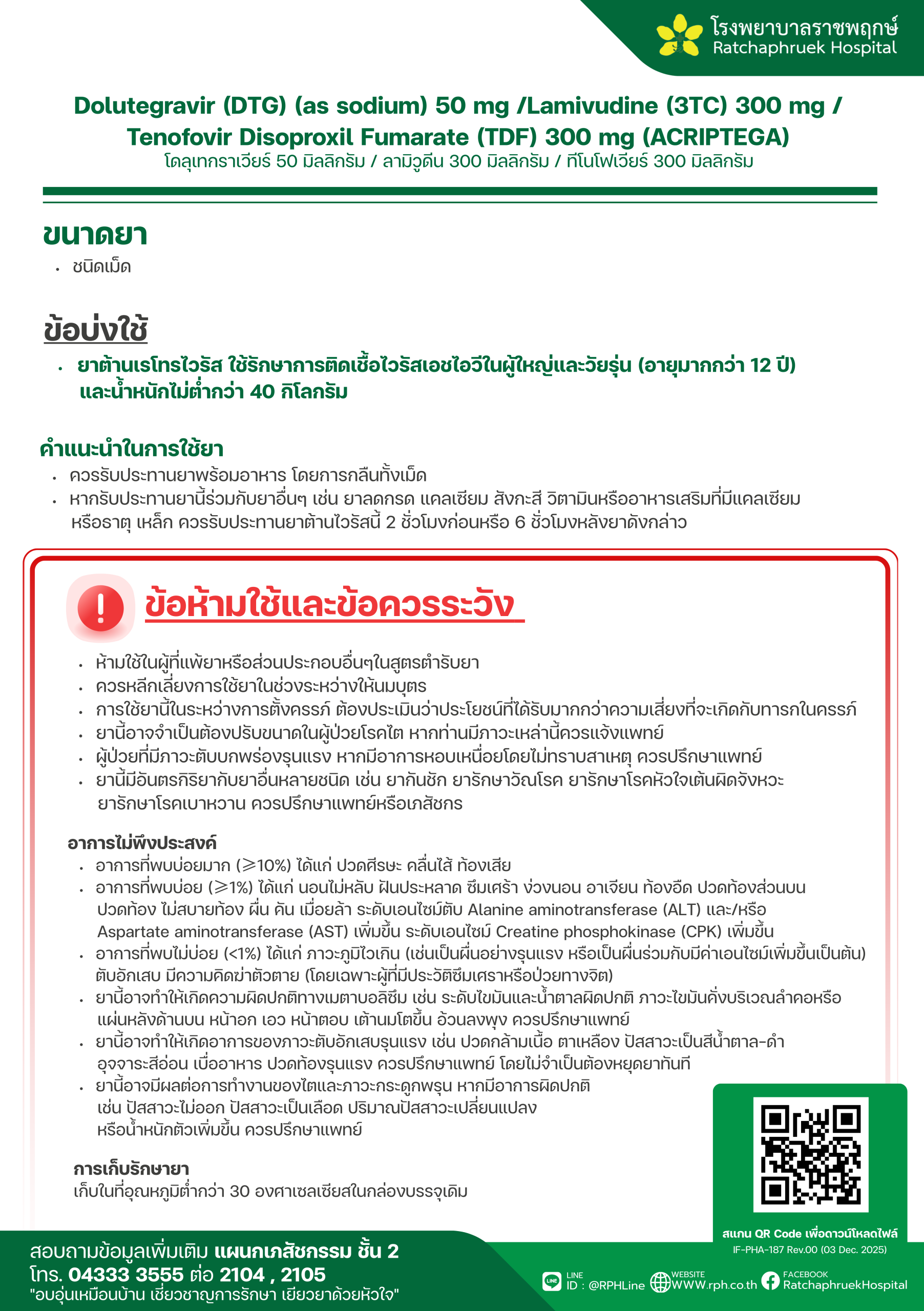 Drug Information Dolutegravir (DTG) (as sodium) 50 mg /Lamivudine (3TC) 300 mg / Tenofovir Disoproxil Fumarate (TDF) 300 mg (ACRIPTEGA) (โดลุเทกราเวียร์ ลามิวูดีน และ ทีโนโฟเวียร์ ) เมื่อวันที่ 12 มกราคม 2569