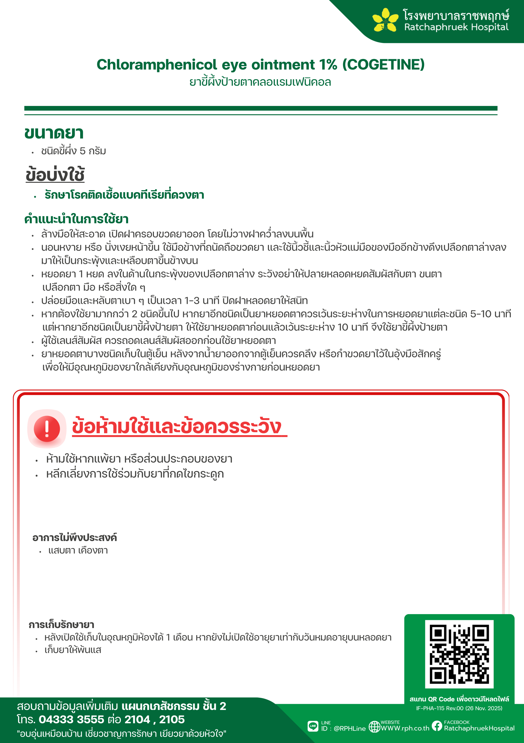 Drug Information Chloramphenicol eye ointment 1% (COGETINE) (ยาขี้ผึ้งป้ายตาคลอแรมเฟนิคอล) เมื่อวันที่ 7 มกราคม 2569