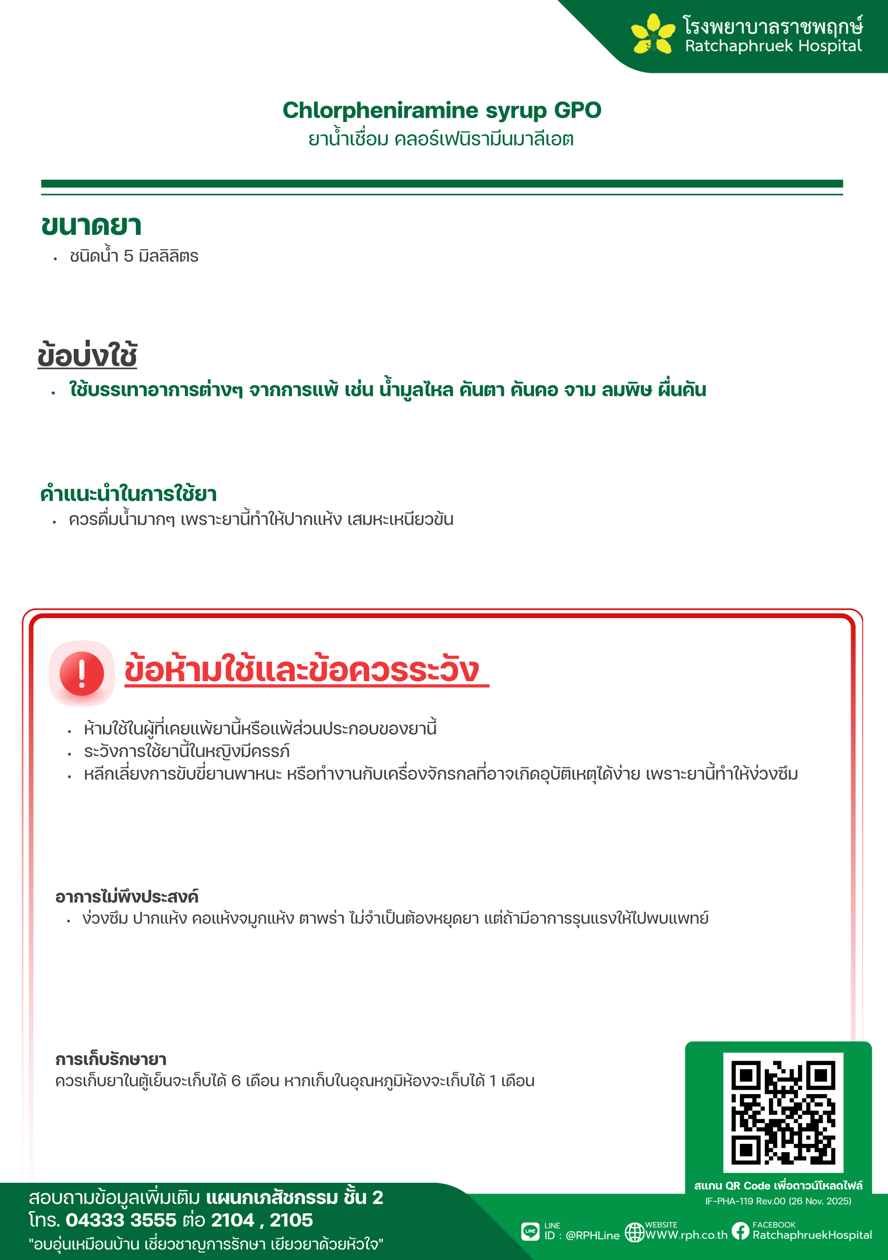 Drug Information Chlorpheniramine syrup GPO (ยาน้ำเชื่อม คลอร์เฟนิรามีนมาลีเอต) เมื่อวันที่ 8 มกราคม 2569