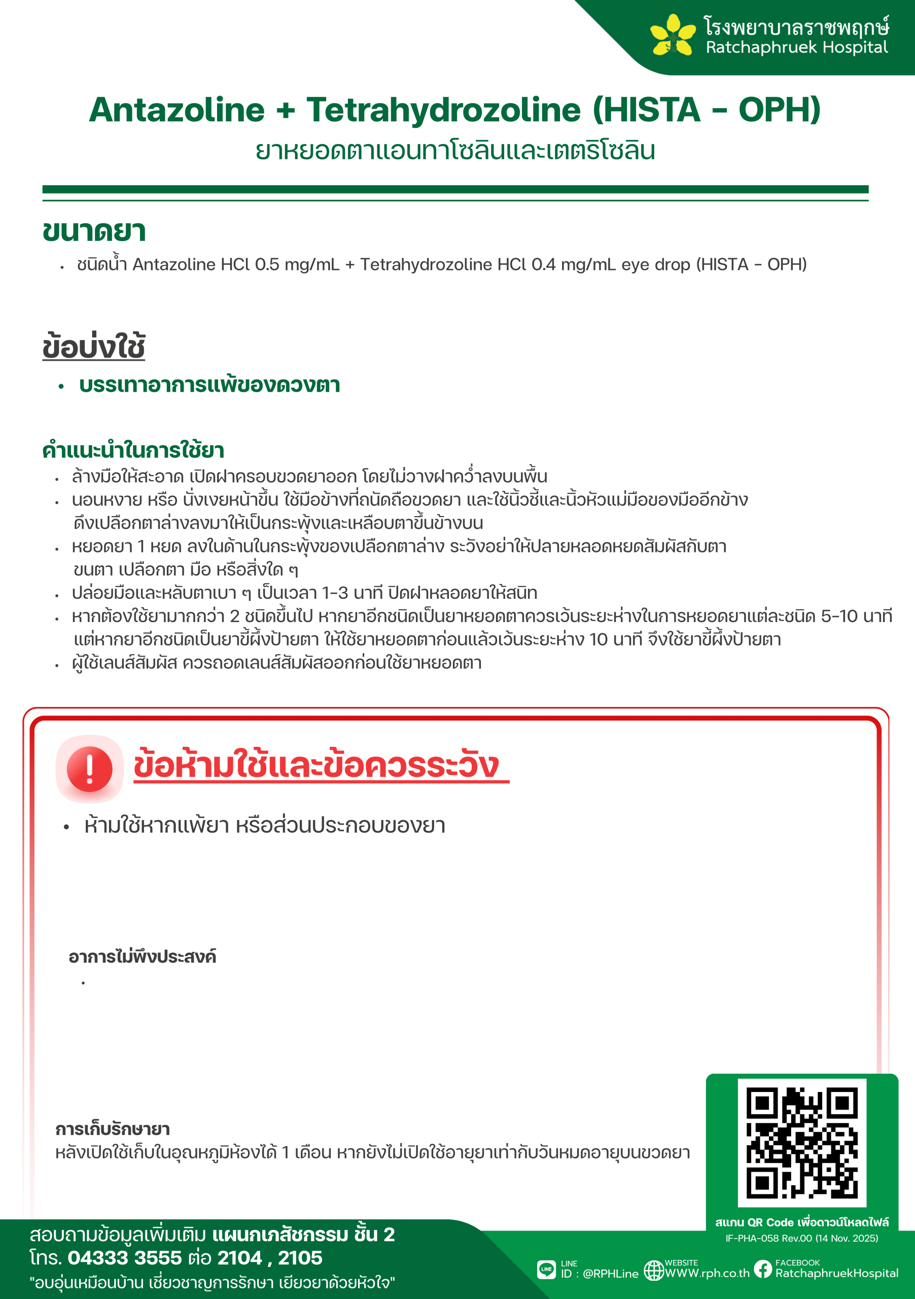 Drug Information Antazoline + Tetrahydrozoline (HISTA – OPH) (ยาหยอดตาแอนทาโซลินและเตตริโซลิน) เมื่อวันที่ 5 มกราคม 2569
