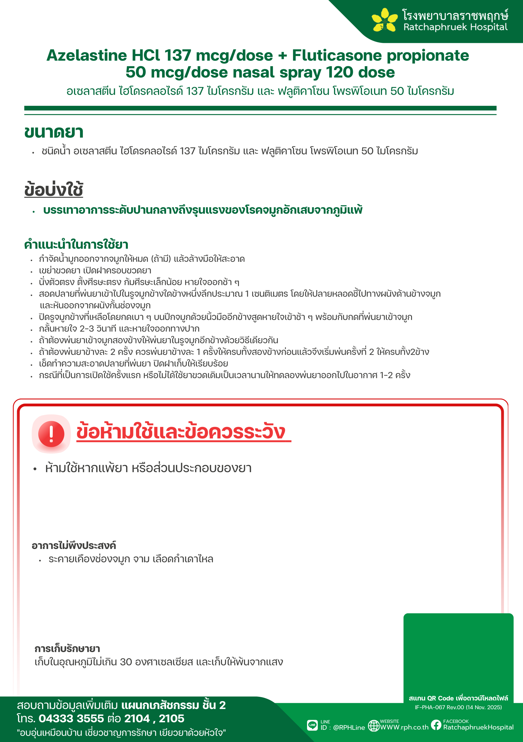 Drug Information Azelastine HCl 137 mcgdose + Fluticasone propionate 50 mcgdose nasal spray 120 dose (อเซลาสตีน ไฮโดรคลอไรด์ และ ฟลูติคาโซน โพรพิโอเนท) เมื่อวันที่ 5 มกราคม 2569