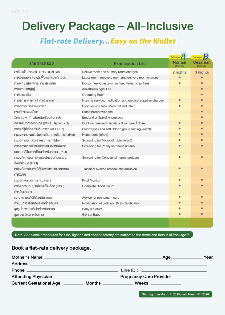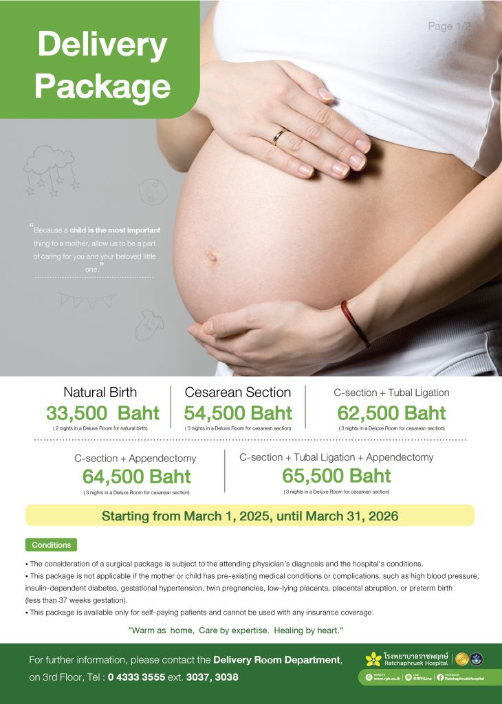 Because a child is the most important thing to a mother, allow us to be a part of caring for you and your beloved little one. The all-inclusive delivery package offers you a special price for both natural and cesarean deliveries, Provided by specialized doctors and staff with expertise, adhering to internationally recognized standards, trusted consistently at Ratchaphruek Hospital.