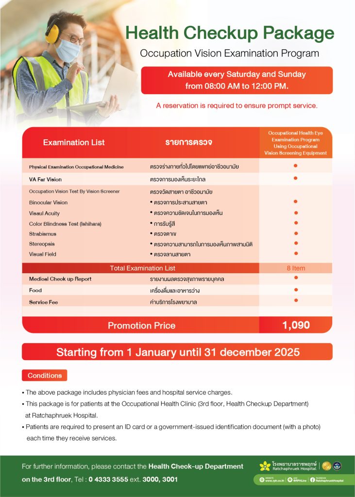 - This package is for clients of the Occupational Medicine Clinic (3rd Floor, Health Check-up Department) at Ratchaphruek Hospital.
