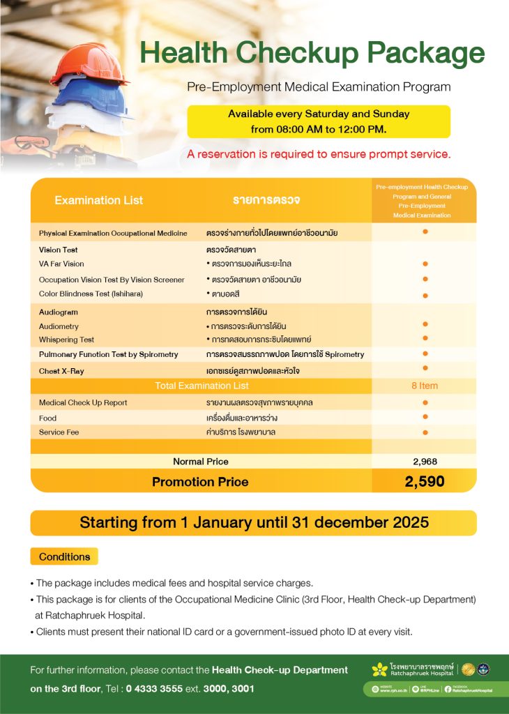 - This package is for patients at the Occupational Health Clinic (3rd floor, Health Checkup Department) at Ratchaphruek Hospital.