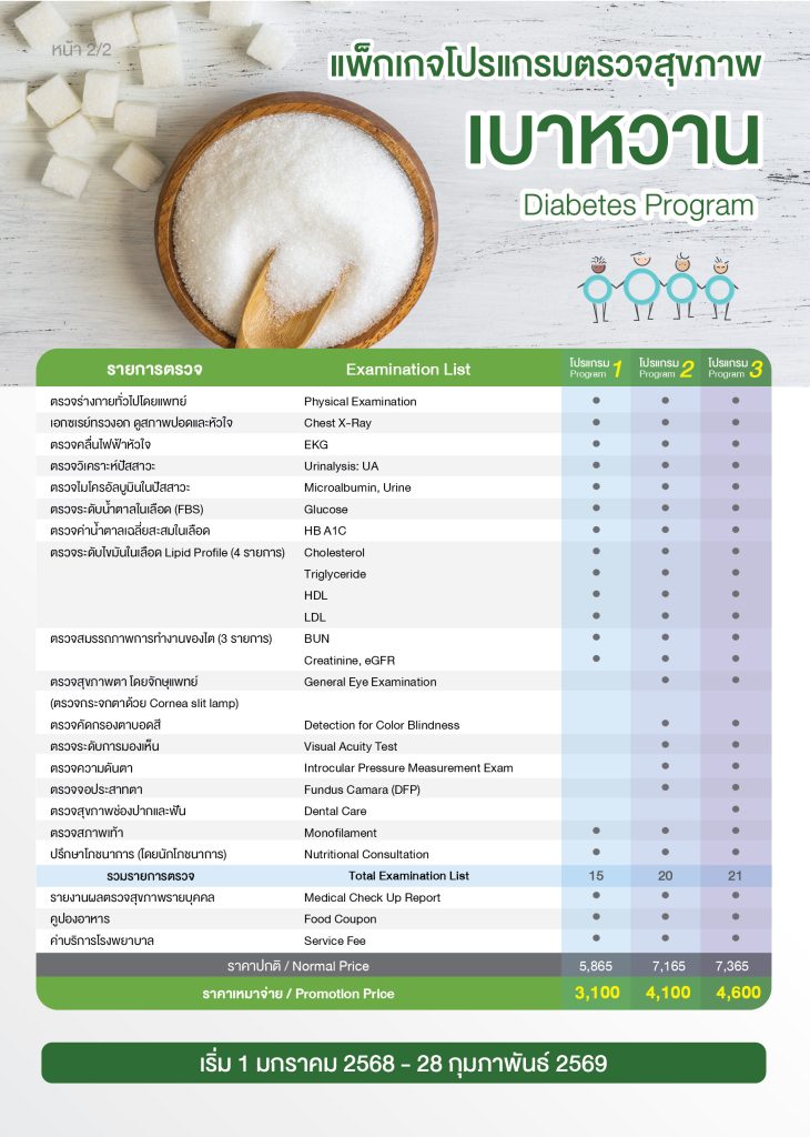 วันนี้เราจึงอยากส่งมอบ ความห่วงใย ผ่านโปรแกรมตรวจสุขภาพเบาหวานในราคาเหมาจ่าย เริ่มต้นที่ 3,100 บาท