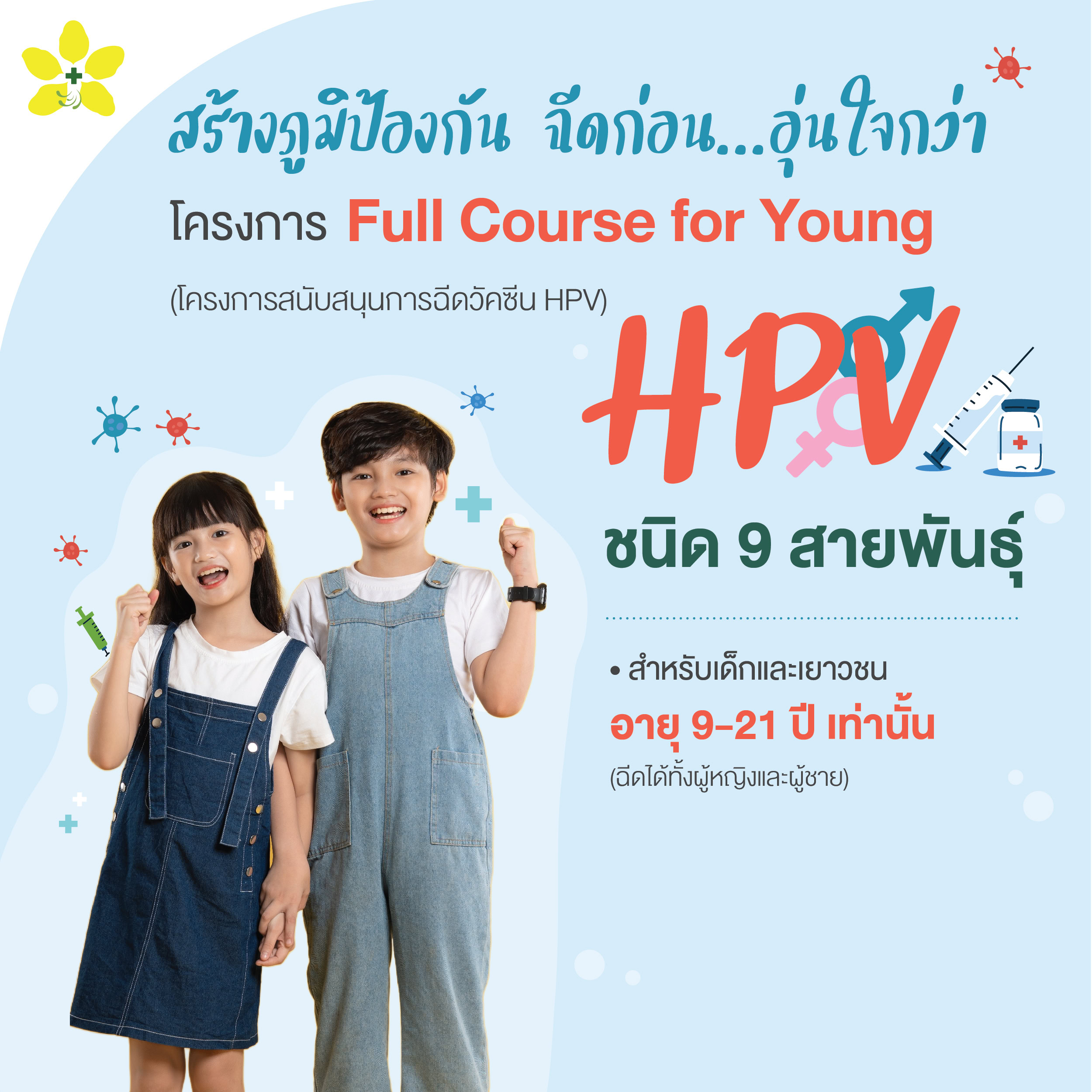 • สำหรับเด็กและเยาวชน อายุ 9-21 ปีเท่านั้น (ฉีดได้ทั้งผู้หญิงและผู้ชาย)