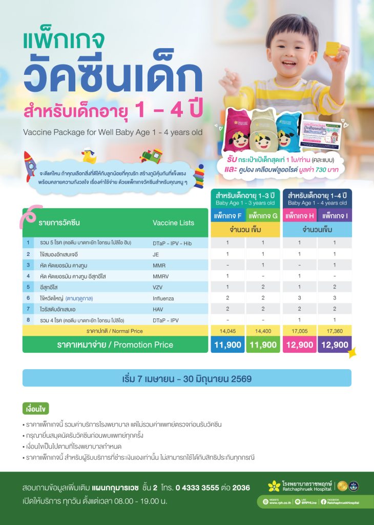 - ราคาแพ็กเกจนี้ รวมค่าบริการโรงพยาบาล แต่ไม่รวมค่าแพทย์ตรวจก่อนรับวัคซีน