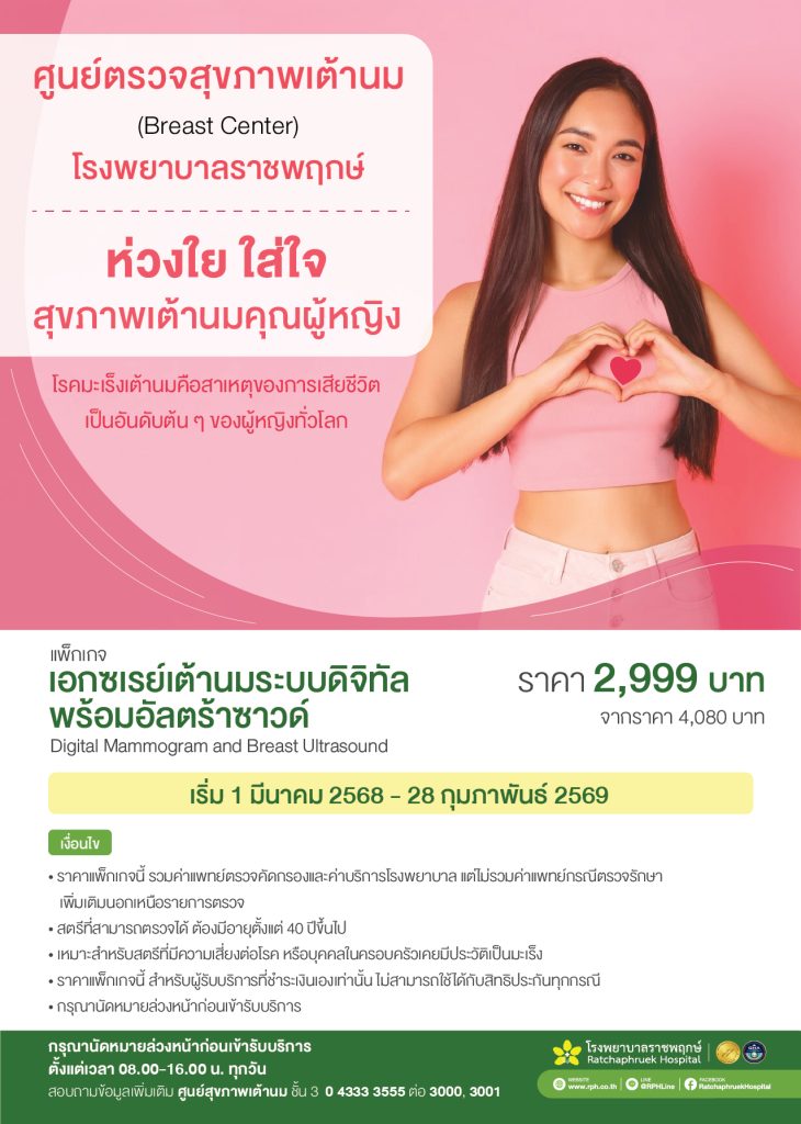 โรงพยาบาลราชพฤกษ์ ห่วงใย ใส่ใจ สุขภาพเต้านมคุณผู้หญิง โรคมะเร็งเต้านมคือสาเหตุของการเสียชีวิตเป็นอันดับต้น ๆ ของผู้หญิงทั่วโลก