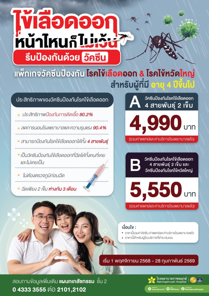 B : วัคซีนป้องกันโรคไข้เลือดออก 4 สายพันธุ์ 2 เข็ม & วัคซีนป้องกันโรคไข้หวัดใหญ่ 1 เข็ม