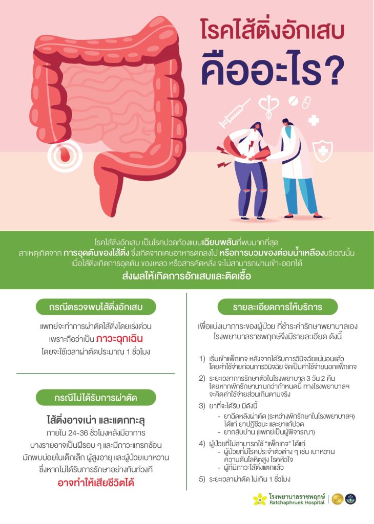 ไส้ติ่งอักเสบเป็นภาวะฉุกเฉินที่ต้องได้รับการรักษาโดยการผ่าตัดอย่างทันท่วงที แพ็กเกจนี้เป็นการผ่าตัดเปิดหน้าท้องเพื่อตัดนำไส้ติ่งที่อักเสบออก