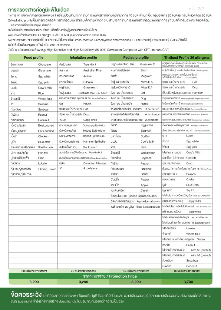แพ็กเกจนี้เป็นการตรวจเลือดเพื่อหาสารก่อภูมิแพ้ชนิดต่าง ๆ โดยการตรวจเลือด