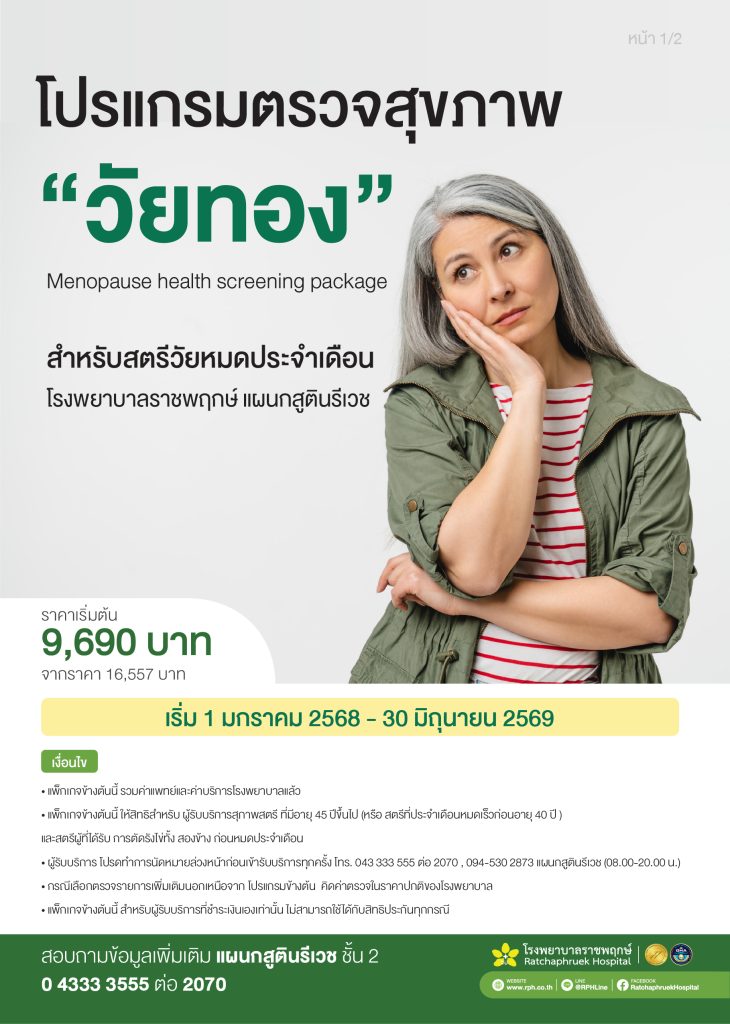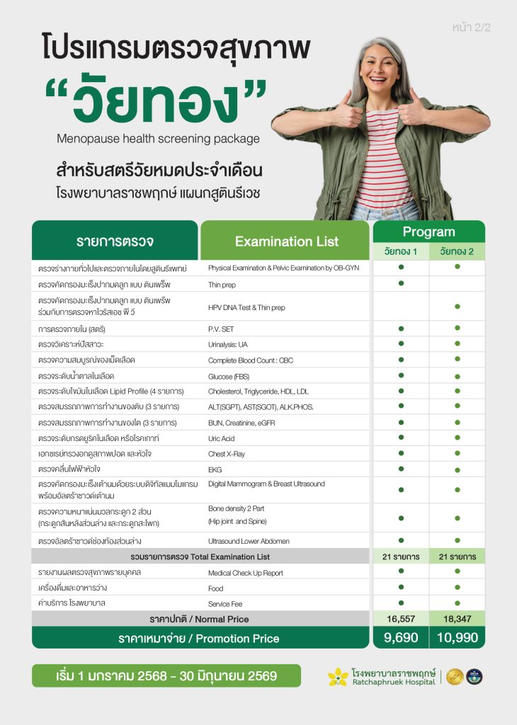 - กรณีเลือกตรวจรายการเพิ่มเติมนอกเหนือจาก โปรแกรมข้างต้น คิดค่าตรวจในราคาปกติของโรงพยาบาล