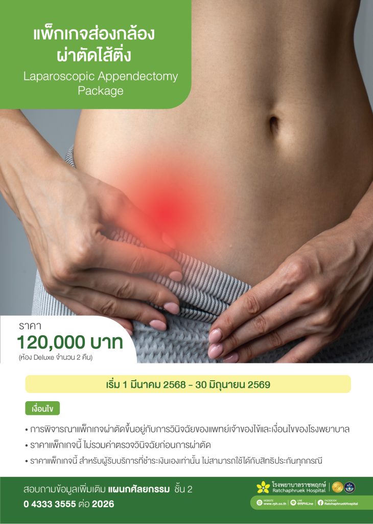 ไส้ติ่งอักเสบเป็นภาวะฉุกเฉินที่ต้องได้รับการรักษาโดยการผ่าตัดอย่างทันท่วงที แพ็กเกจนี้เป็นการผ่าตัดผ่านกล้องเพื่อตัดนำไส้ติ่งที่อักเสบออก