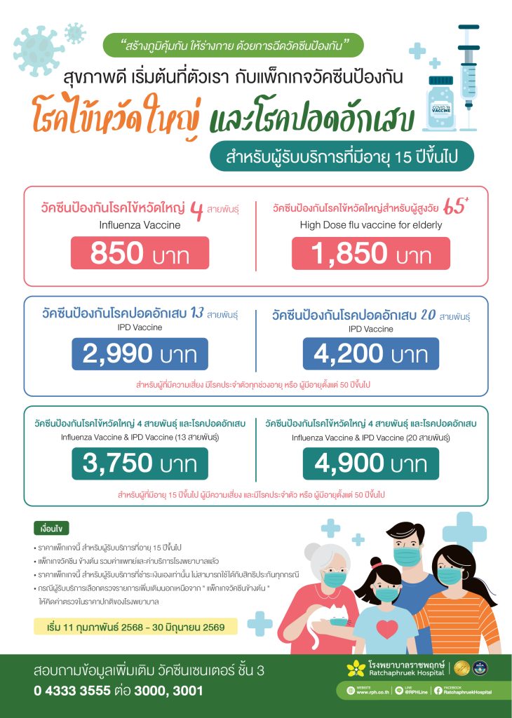 วัคซีนป้องกันโรคไข้หวัดใหญ่ 4 สายพันธุ์ และโรคปอดอักเสบ Influenza Vaccine & IPD Vaccine ( 13 สายพันธุ์) 3,750 บาท สำหรับผู้ที่มีอายุ 15 ปีขึ้นไป ผู้มีความเสี่ยง และมีโรคประจำตัว หรือ ผู้มีอายุตั้งแต่ 50 ปีขึ้นไป