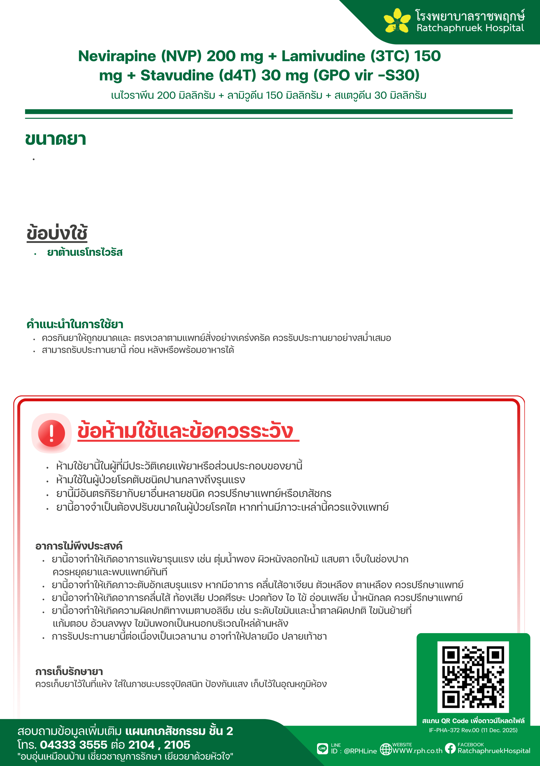 Drug Information Nevirapine (NVP) 200 mg + Lamivudine (3TC) 150 mg + Stavudine (d4T) 30 mg (GPO vir -S30) (เนไวราพีน ,ลามิวูดีน และสแตวูดีน) เมื่อวันที่ 26 มกราคม 2569